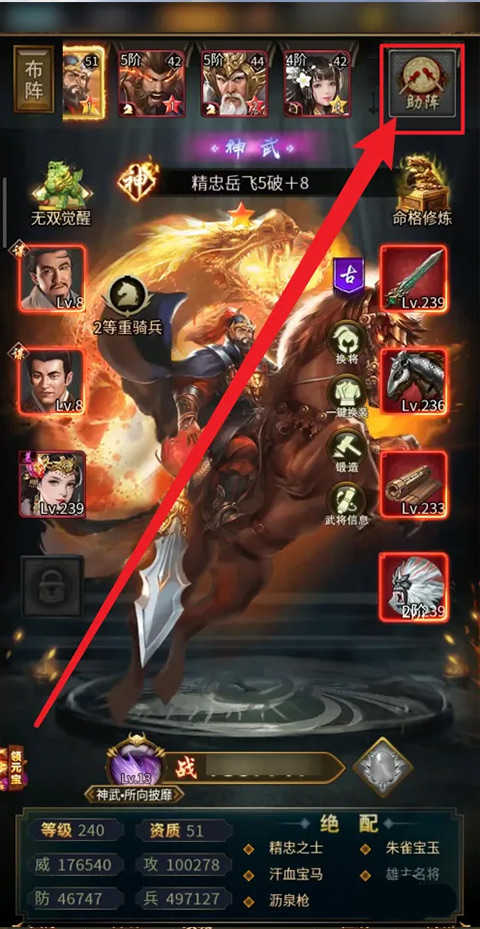 最后点击选用助阵角色即可完成阵容配队,推荐岳飞,或者关进行助阵