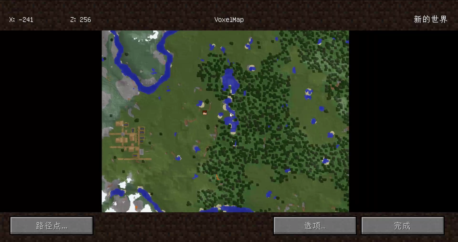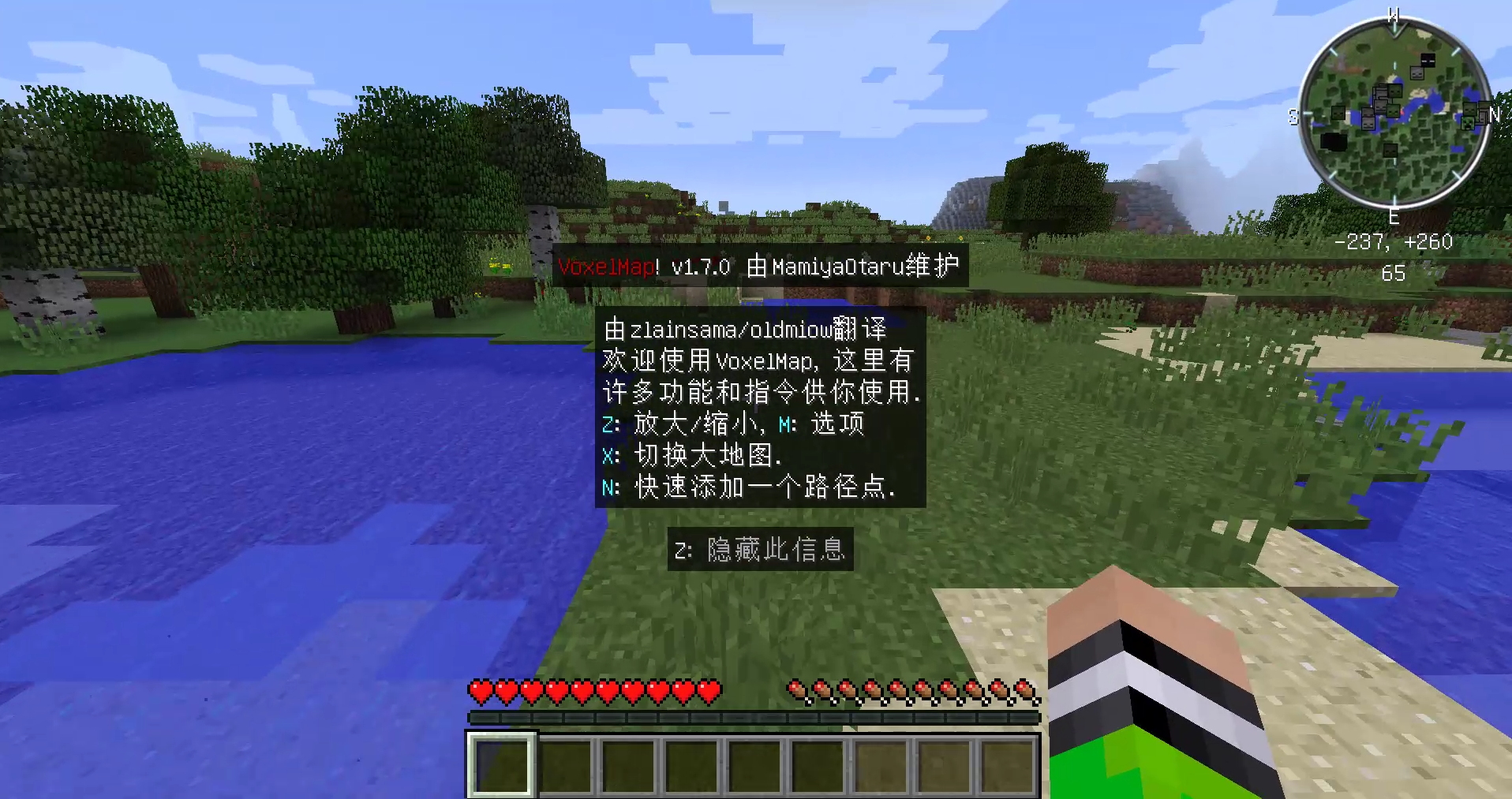 VoxelMap小地图可以为你解决以上的所有问题,同时还为你提供了一些额外的非常不错的辅助功能,一起来看一下吧。当你进入游戏,看到地图的提示信息,以及右上角的位置有一个圆形的地图,那么恭喜你,你的小地图模组安装成功了。