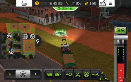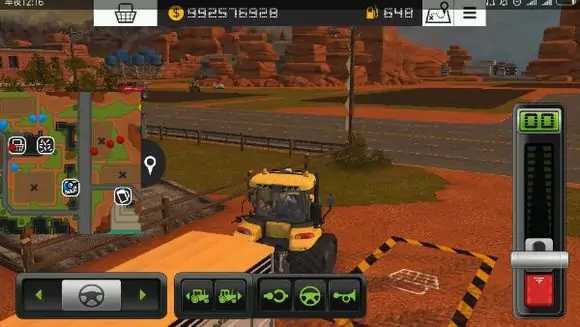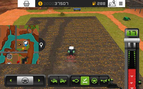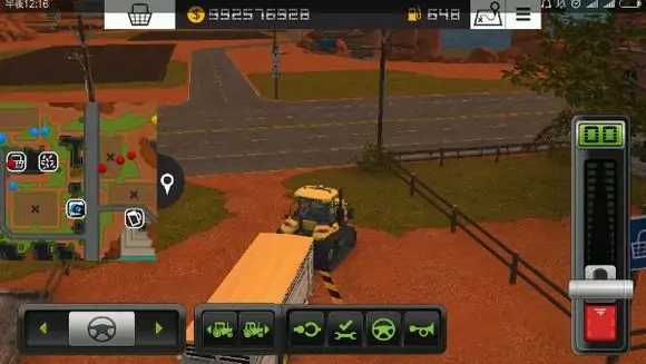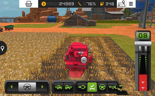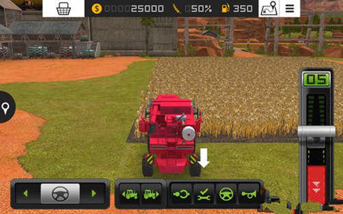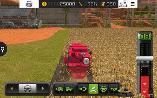游戏中我们要控制各种农用车辆和工具来工作,首先就是控制收割机,将屏幕右边的推杆向上推,收割机就会向前行动,推杆向下推到红色区域,收割机就会后退。