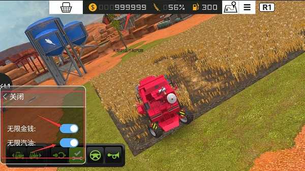 这里要提醒大家,在收割的时候一定要点击一下屏幕下方的“扳手”按钮,只有扳手按钮亮起来,才说明开始工作了,否者我们即使开着收割机进入麦田,也是不会收割麦子的。