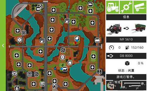 土地翻新好之后,我们点击屏幕下方扳手按钮左边的按钮,它可以让我们的拖拉机和身后的耕种设备分离开来,然后将拖拉机开到绿色的播种机前面,拖拉机就会和播种机相连。
