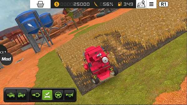 2、但如果你觉得自己的开车技术实在烂的话,小编这里可以教大家一个方法:先把收割机开到小麦附近,然后点击屏幕下方的“方向盘按钮”,这样收割机会自动收割小麦。