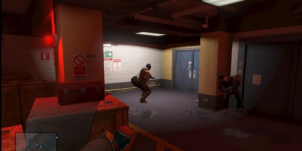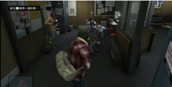 step1:(指南针是以线性的形式)进入银行的玻璃柜台内,此时麦克需要利用机枪分别瞄准蹲下(躺下)的三名人质,他们便会自觉地进入右侧的办公室内。