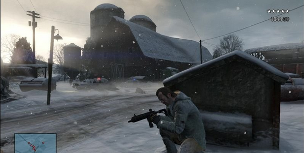当清理“前线”的警察后再往警车冲去,以警车作为掩体逐步推进至银行大院的大门进入到农场内,在公路会冲进来4輛警车,以同样的方式推进。