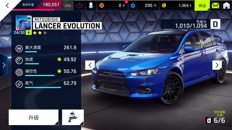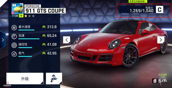 每辆车都有自己的性能分(红框内),玩家只要在车库里面点击要升级的车辆,就会进入到车辆改造界面,在点击升级,就可以对其进行升级增加其性能评分。玩家可以通过生涯、多人等赛事获得车辆蓝图。用蓝图解锁车辆,增加车库价值。还可以把一些低级的赛车升级(高级车升级费过高,不推荐),通过其性能评分的增长来提升车库等级。