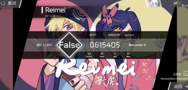 4、每首歌曲结束的时候会有一个评价出现。例如这图里面的False代表的是挑战失败,右边则是分数。