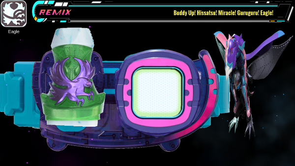 变身音效为“Buddy up!暴乱!腾飞!翱翔天际!Eagle!来细数你的羽毛吧!”