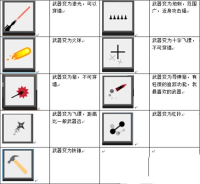 12子弹变大:子弹变大、子弹变飘,在很多时候有特殊的附加效果,如激光射程会大幅度提升,地刺变尖、射程提升,大刀刀片的伤害范围扩大,炸弹爆炸范围扩大,吹针穿墙概率降低