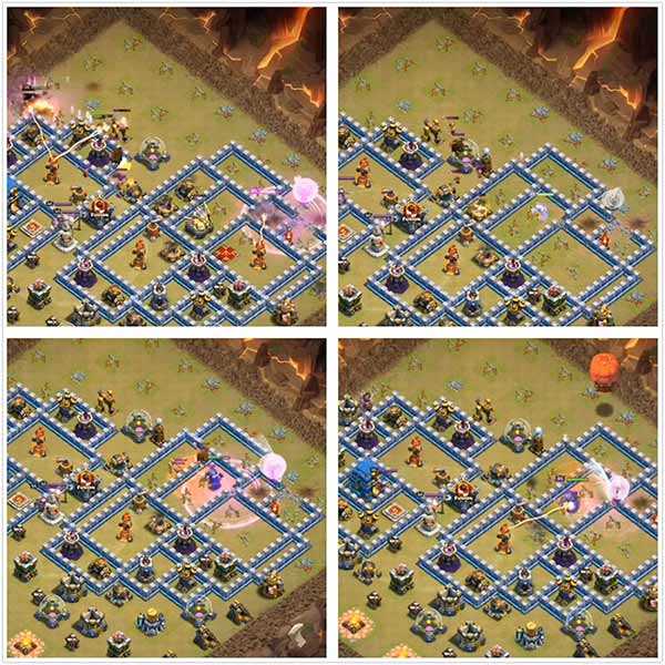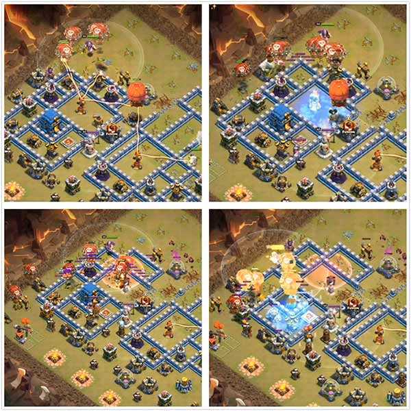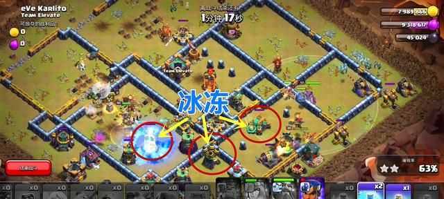 狗球配合永王从12点往大本营方向前进,路上永王技能来躲避大本营爆炸伤害,冰冻法术则给在了地狱塔和防空这里,几秒的时间足够气球飞向这些防御建筑了。