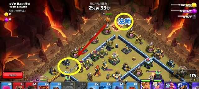 想要达到让“蛮王”滑步往9点钟方向清边,具体的操作是:先下蛮王吸引防御建筑的火力,在下法师断掉“兵营”这样蛮王的进攻线路就只能往9点钟方向前进,到了“炸弹人”开墙的地方,这个缺口就会产生一定的引导作用,只要上方建筑清理的足够干净,蛮王就会进入到这个区域里,为我们清理掉天鹰火炮和多头地狱塔,前戏的部分基本完成。