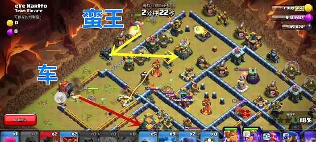 打这个阵型最重要的就是时间问题,在蛮王清边的同时,攻城车也要进入到战场里面,因为“攻城车”也有一定的引导作用,这样“女王”才会跟着攻城车打掉敌方“大本营”的同时,做掉那个单头地狱塔。