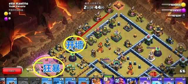 由于“天女”顶不住投石炮和X弩的联合攻击,所以狂暴法术是一定要给的,上面开墙的目的是想让“蛮王”滑步回来,打掉12点区域的天鹰火炮和多头地狱塔。