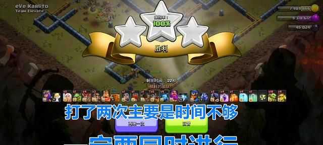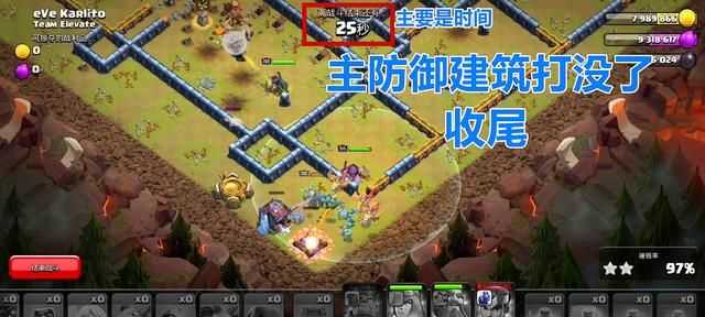 要点:在我方“龙骑士”抗住女王伤害的时候,我方就要释放“英雄猎手”帮助我方闰土先打掉敌方女王,因为敌方的女王要比防御建筑给我们造成的伤害还要大,所以这个操作一定不要忘记。