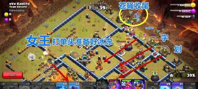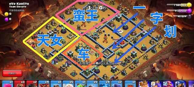 当蛮王打掉12点方向的区域以后,我们就可以进行“龙骑士一字划”了,但是目光也要照顾到4点钟方向的女王,因为女王在配合攻城车打掉敌方“大本营”以后,即将面临“单头地狱塔”的考验,所以要掐准时机释放“冰冻法术”为女王解围,这是也是最后的难点了。