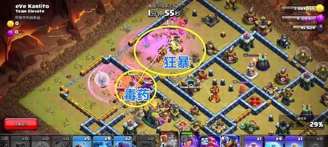 在“攻城车”到达敌方大本营的时候,就会触发敌方“部落城堡”里面的援军,毒药加狂暴法术打掉敌方“部落援军”的同时还能打掉敌方的闰土,这是一个一举两得的事情,而蛮王在清理上面区域的时候,也不要不管他,给他一瓶狂暴法术能够让蛮王清理得更加快速和干净。