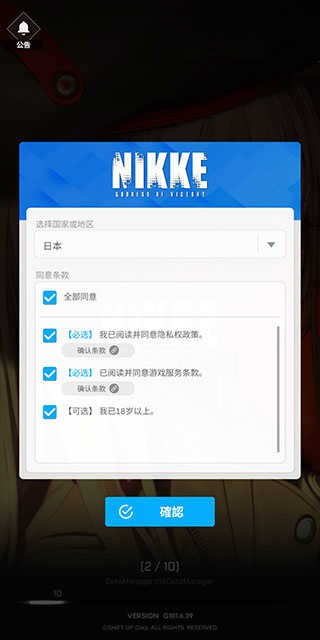 1、下载并安装胜利女神台服后,打开游戏之后首先需要玩家们先选择国家地区(服务器选择在后方),勾选全部同意选项后,之后点击下方的确认按钮继续操作。
