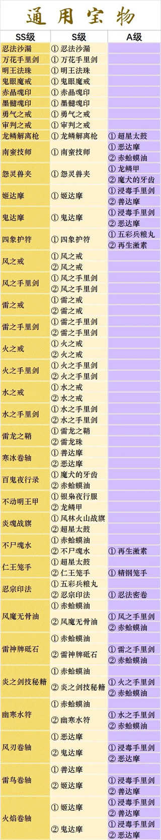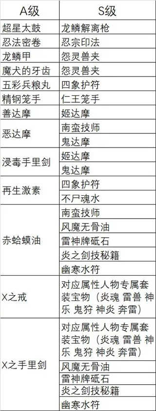 所有的“老”流派和银枭(即:炎魂小黑、雷兽阿力、神乐琳、鬼狩苍牙、神炎小椒、奔雷银枭)专属套装SS级宝物需要1同名S级宝物,而该S级宝物合成需要同属性的A级戒指和手里剑;