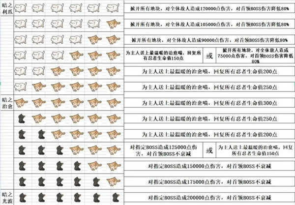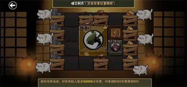 1、6只白猫发动暗之利爪:掀开所有地块,对全体敌人造成120000点伤害,对首领BOSS伤害降低80%(搭配任意猫依次递减)