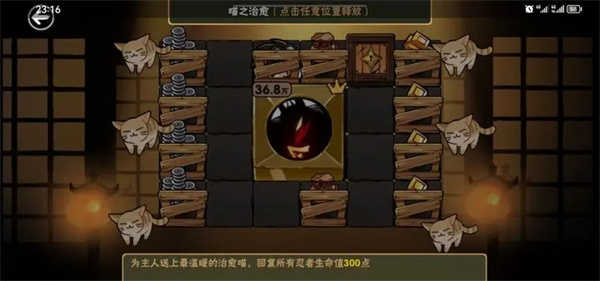 3、6只黄猫发动暗之治愈:为主人送上最温暖的治愈喵,回复所有忍者生命值300点(搭配任意猫依次递减)