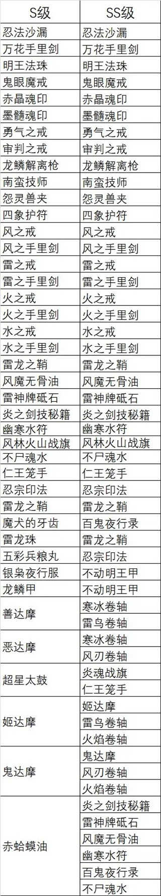 同时需要注意,A级魔犬的牙齿、五彩兵粮丸、善达摩、恶达摩、赤蛤蟆油、超星太鼓、银枭夜行服、龙鳞甲等不是合成同名S级宝物的特定宝物
