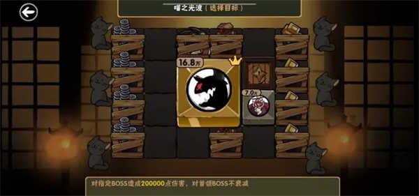 2、6只黑猫发动暗之光波:对指定BOSS造成200000点伤害,对首领BOSS不衰减(搭配任意猫依次递减)