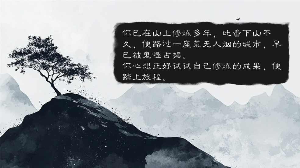 1、下载游戏后点击屏幕中的开始游戏即可游玩,你已在山上修炼多年,此番下山不久,便路过一座荒无人烟的城市,早已被鬼怪占据。你心想正好试试自己修炼的成果,便踏上旅程;