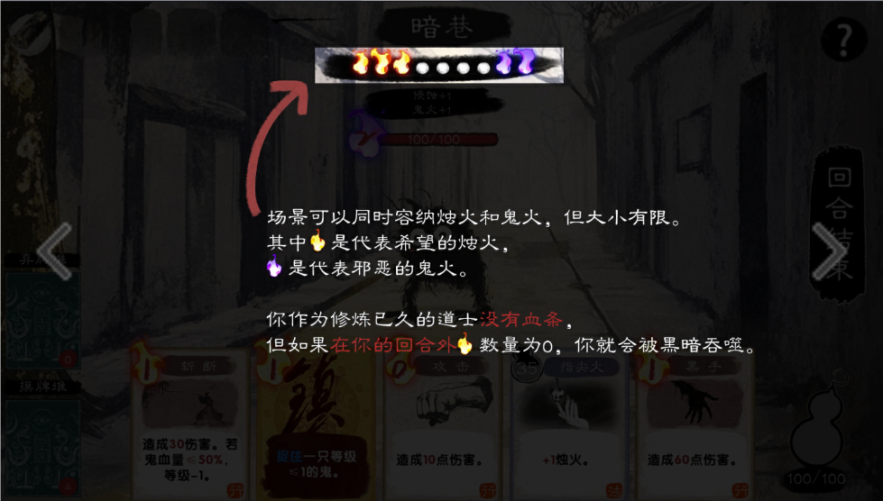 3、你作为修炼已久的道士没有血条,但如果在你的回合外黄色的火焰数量为0,你就会被黑暗吞噬,鬼会不断生成鬼火,来抢占空余槽位。其中带有“侵蚀”能力的鬼生成的!还可以顶掉希望之火;