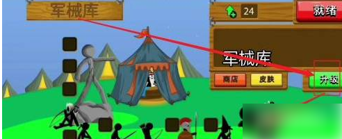 如图所示随后进入【军械库】点击【升级】即可变大(角色体型和战斗力都会变大)。
