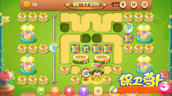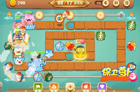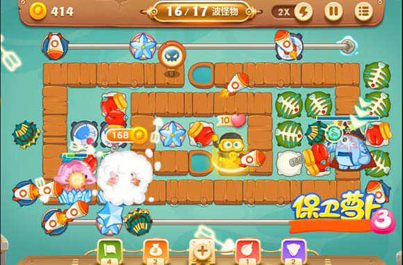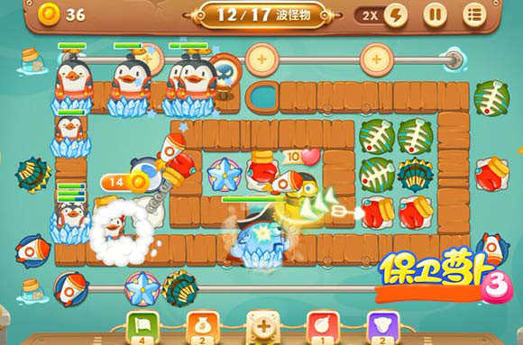 7、在《保卫萝卜3》中,拥有前作中的诸多炮塔,同时也出现了一些全新的防御炮塔,如可以增加炮塔攻击力的“地雷”、单体超强攻击能力的“雷达”等。