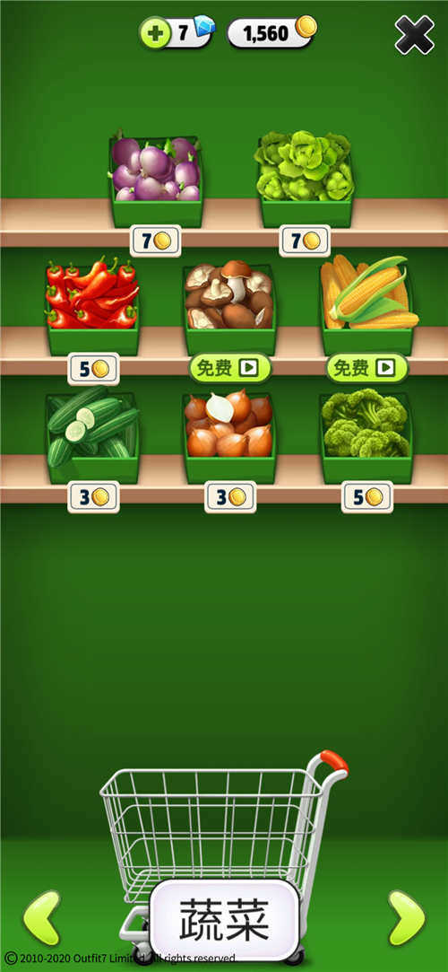 2、点进去以后我们能看到有八个货架选项,都是不同种类的食物,有些货架需要等级解锁才能获得。每个货架上陈列着不同食物,货架上的食物有些可以看视频免费获得,大多都是标明了价格的,都要金币购买!