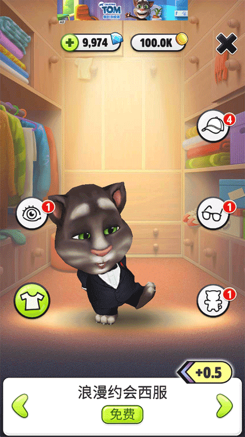4、当你拥有了这件衣服后,就会有一个“选择”的选项,点击后,汤姆猫就换上了,如果你觉得不满意的话,可以点击移除,这样汤姆猫就会脱下这个物品。