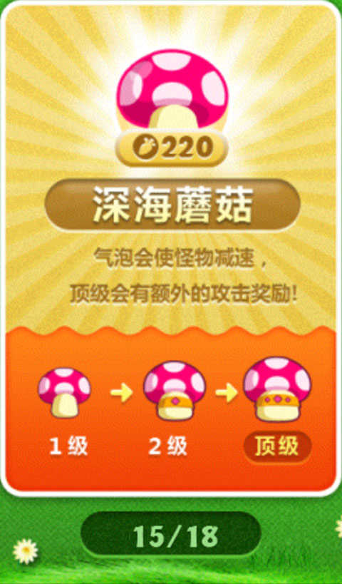 将上面的两个多重箭升到满级之后就开始放深海蘑菇,优先放3个深海蘑菇,然后在放个鱼刺。之后在升级另外两个多重箭。