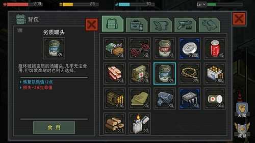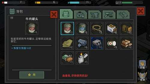 7、同样如果饥饿值降低后,也需要食用一些食物来填饱肚子,而血量减少后,点击止血绷带或者血包就可以提升血量。