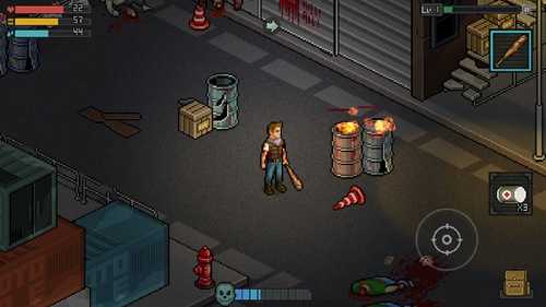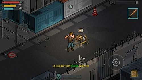 1、进入游戏后,我们会在地上捡到一根棒球棍,这就是我们的初始武器了,直接点击屏幕左下角的攻击按钮就能自动攻击自己身边的僵尸。
