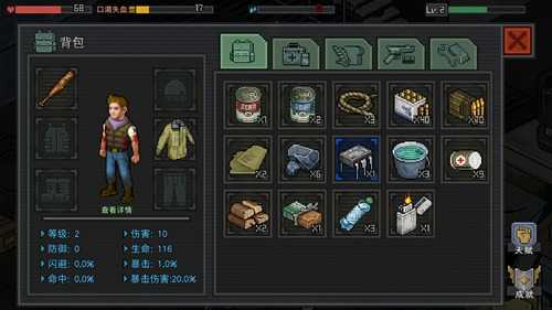 5、点击屏幕右下角的背包我们可以看到自己获得的材料和资源,有各种食物、水、血包等生存必需品,也有绳子、子弹、布料、打火机等道具。