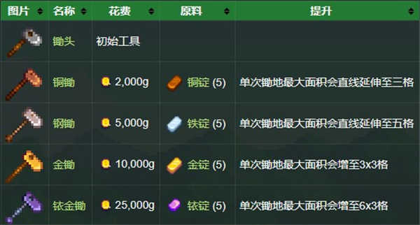 玩家可以使用锄头挖土及耕种。锄头升级后,长按左键蓄力可以一次锄一片地,锄地的面积大小取决于你你锄头的等级以及蓄力时间的长短。锄头可以用来挖远古斑点从而得到隐藏的物品。
