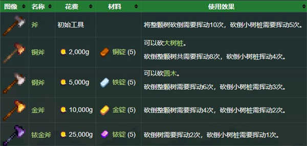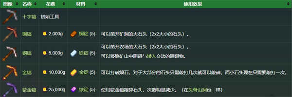 每次工具升级都会减少敲碎石块所需的次数,并允许玩家敲碎更为坚硬和巨大的岩石。
