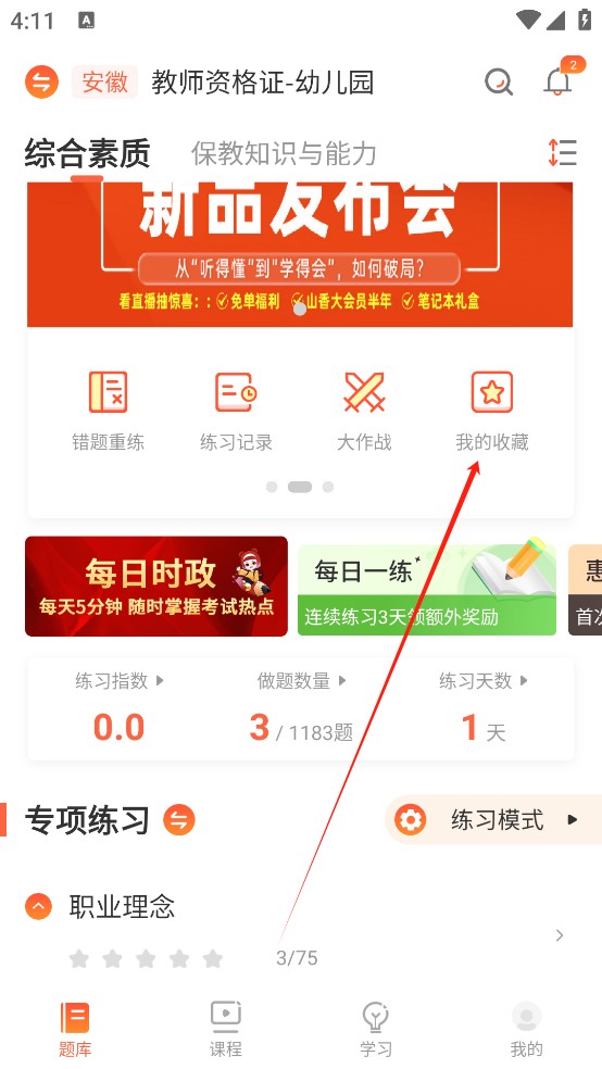 1、打开山香网校App并登录软件,向左滑动找到我的收藏;