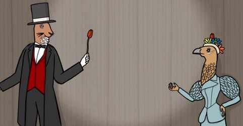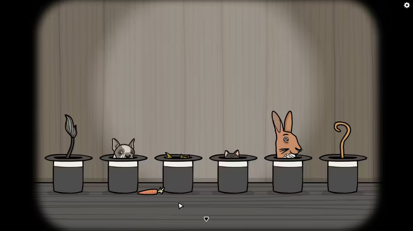 13、第十三幕:将正确的食物放入藏着不同动物的魔术帽中。动物从左到右分别是牛、狗、松鼠、猫、兔子、猴子。
