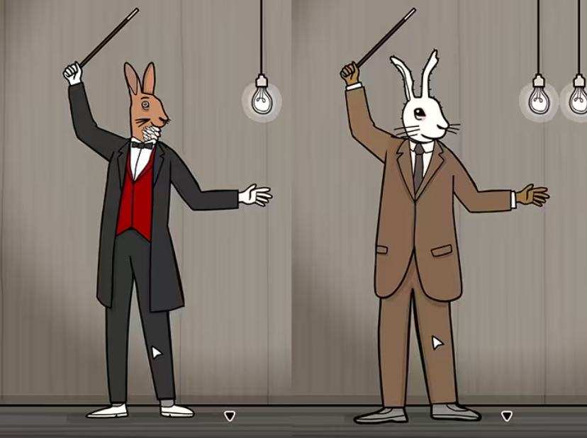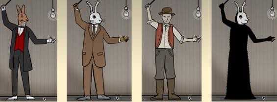 11、第十一幕:每次点击兔子先生的魔法棒,都会点亮/熄灭枚灯泡。可以通过点击兔子先生的左手进行水平位移,通过点击兔子先生的帽子进行竖直位移,最终将所有灯泡点亮。