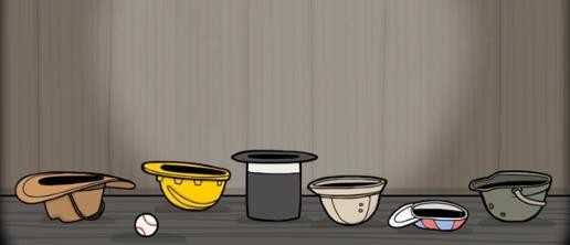 点击帽子,出现手枪。左边射两发,右边射两发,然后在帽子右边一点的顶部也射1发就会出现所有帽子。接着再射1发出现1个棒球。