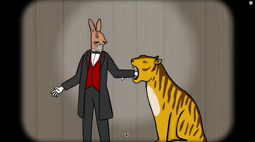 6、第六幕:只有当老虎闭上眼睛的时候,才可以按住兔子先生让他伸手臂。否则兔子先生的手臂会被老虎吃掉