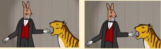 在老虎闭眼的时候按住兔子的手,他就会伸手进去,如果在按着的时候老虎睁眼,他就会咬掉兔子的手。