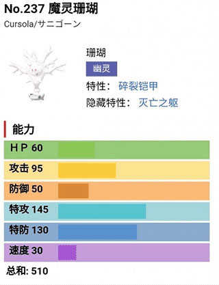 魔灵珊瑚是一个幽灵属性的宝可梦,拥有难以置信的高达145的特攻和139特防属性,可以让强大的敌人在攻击的时,与自己一起进入濒死状态。