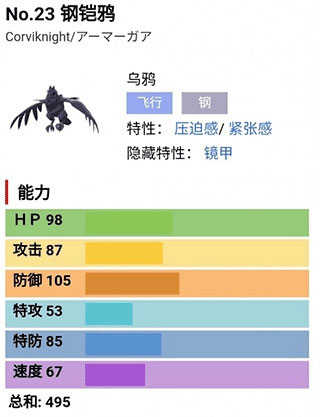 钢铠鸦是由稚山雀进化而来的宝可梦,它不仅生存能力非常出色,拥有105的防御、85的特防和98的HP,其飞行和钢的特性,也使其打击面非常广。大家前期还是非常有必要获取它的哦。
